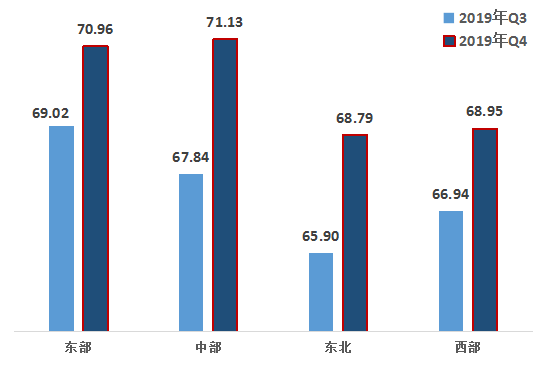 從區(qū)域來看,中部地區(qū)改革熱度崛起,東北地區(qū)與其他地區(qū)的差距呈縮小狀態(tài)。第四季度,東部、中部、東北、西部的改革熱度指數(shù)分別為70.96,71.13,68.79,68.95,比上一季度均有上升。其中,中部、東北地區(qū)的升幅較大。