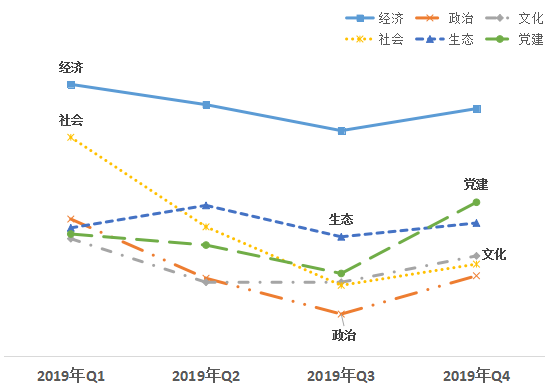 從領(lǐng)域來看,文化、政治領(lǐng)域改革熱度值偏低,黨建領(lǐng)域提升最多。第四季度,經(jīng)濟(jì)領(lǐng)域得分78.41,政治領(lǐng)域得分65.95,文化領(lǐng)域得分67.43,社會(huì)領(lǐng)域得分66.82,生態(tài)領(lǐng)域得分69.89,黨建領(lǐng)域得分71.43。