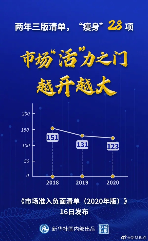 國(guó)家發(fā)展改革委、商務(wù)部16日公布《市場(chǎng)準(zhǔn)入負(fù)面清單(2020年版)》。新版清單直接放開“森林資源資產(chǎn)評(píng)估項(xiàng)目核準(zhǔn)”等措施,刪除“證券公司董事、監(jiān)事、高級(jí)管理人員任職資格核準(zhǔn)”等措施,清單事項(xiàng)縮減至123項(xiàng),比2019年版清單再減8項(xiàng)。(記者安蓓 海報(bào)設(shè)計(jì):張惠慧 張晨光)