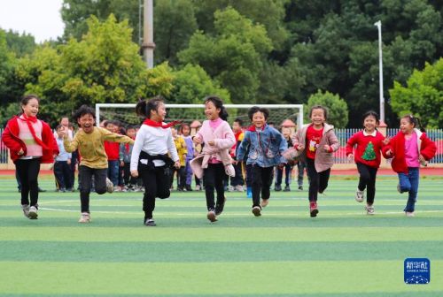 11月4日,在湖南省永州市新田縣雙碧小學,孩子們在運動場上做游戲。今年秋季學期開學以來,各地積極落實“雙減”政策,利用課后服務時間開展內容豐富、形式多樣的課外活動,促進學生全面發(fā)展。新華社發(fā)(劉貴雄攝)