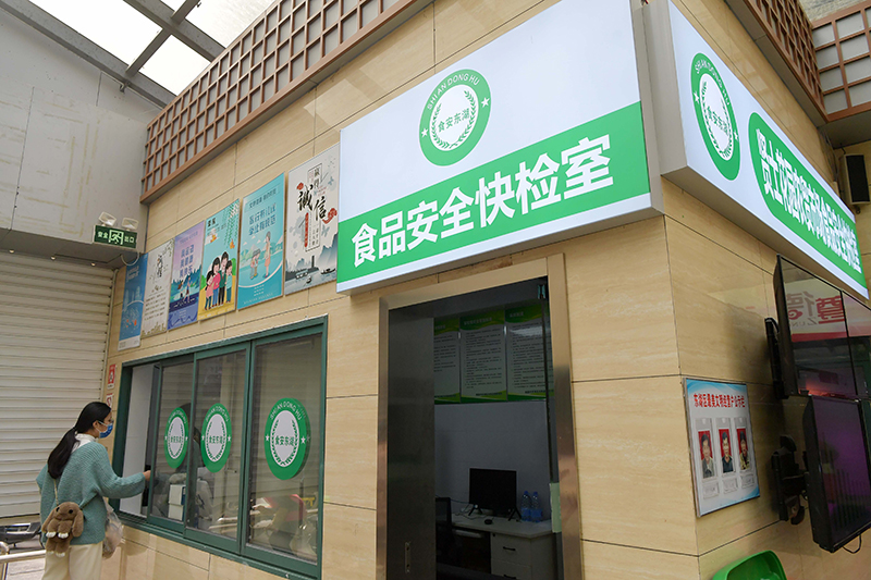 2021年12月7日,在江西省南昌市東湖區(qū)賢士花園農貿市場,市民將剛購買的蔬菜送檢。2021年,東湖區(qū)在全區(qū)11個農貿市場建成食品安全快速檢測室,對市民送檢樣品中的農藥殘留、瘦肉精、甲醛等11種有害物質進行免費現場快速檢測,守護群眾“舌尖上的安全”。新華社記者 彭昭之 攝