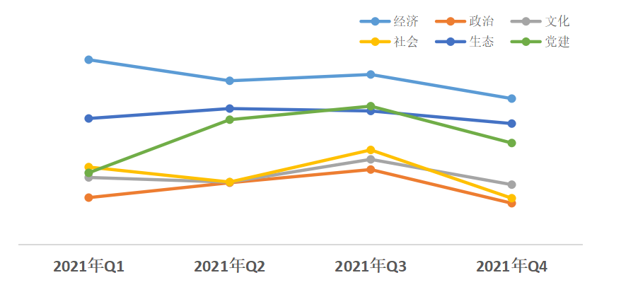 從近幾個季度的評估結果來看,除經濟、生態(tài)領域,其他領域熱度值均在第三季度達到2021年度熱度指數(shù)峰值,但隨后呈下降趨勢。經濟領域熱度值領先其他領域,政治領域改革熱度值偏低;社會、政治、黨建領域降幅較大。
