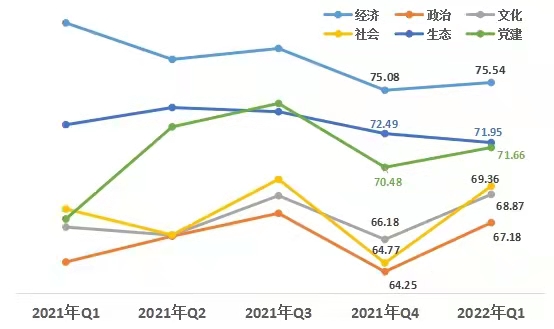 1、從領(lǐng)域來(lái)看,經(jīng)濟(jì)領(lǐng)域增幅低于其他領(lǐng)域。第一季度,經(jīng)濟(jì)領(lǐng)域得分75.54,政治領(lǐng)域得分67.18 ,文化領(lǐng)域得分68.87,社會(huì)領(lǐng)域得分69.36,生態(tài)領(lǐng)域得分71.95,黨建領(lǐng)域得分71.66。與上一季度相比,生態(tài)領(lǐng)域小幅下降,其他五個(gè)領(lǐng)域均上升。其中社會(huì)領(lǐng)域升幅最大,政治領(lǐng)域次之,經(jīng)濟(jì)領(lǐng)域提升最小。