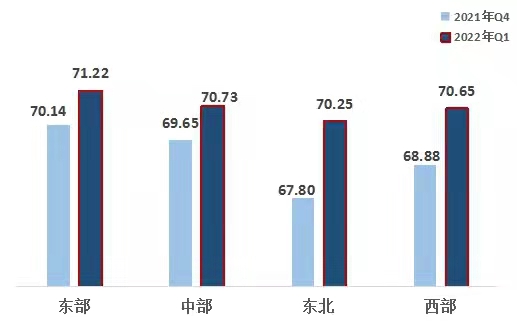 2、從區(qū)域來(lái)看,東北地區(qū)熱度指數(shù)提升明顯。東部、中部、西部、東北指數(shù)分別為71.22、70.73、70.65、70.25。區(qū)域熱度指數(shù)呈地域特征,東部地區(qū)第一,中部地區(qū)第二,西部地區(qū)第三,東北地區(qū)最后。四大區(qū)域均比上一季度明顯上升,其中,東北、西部地區(qū)指數(shù)升幅較大。