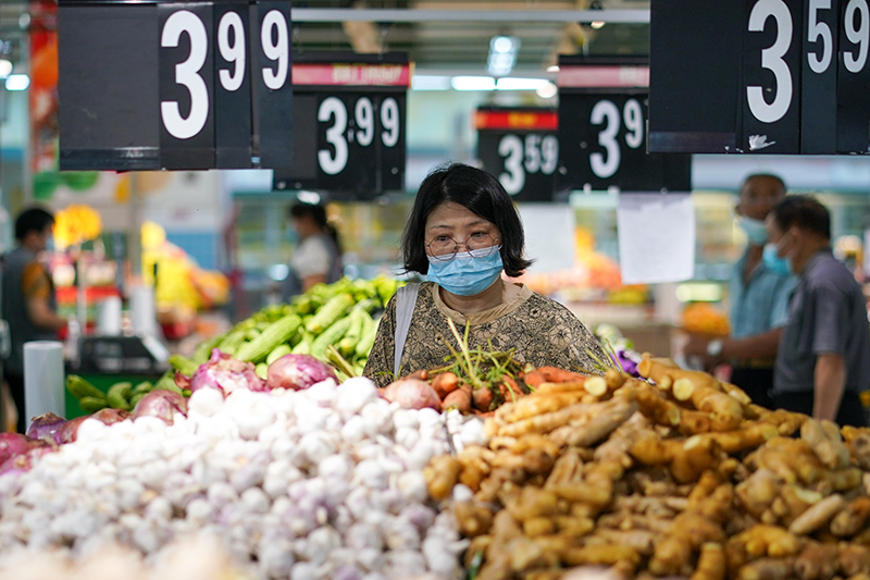 市民在江蘇省無錫市經(jīng)開區(qū)華潤(rùn)萬家超市購物(2022年7月7日攝)。江蘇省無錫市在做好疫情防控的同時(shí),積極制定相關(guān)方案,制作城市保供地圖,組織大型商超、市場(chǎng)正常運(yùn)營(yíng),全力保供穩(wěn)價(jià),端穩(wěn)市民“菜籃子”。新華社記者 李博 攝