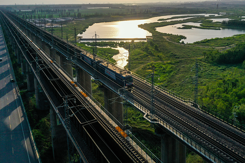 重載列車行駛在大秦鐵路上(2022年7月16日攝,無人機(jī)照片)。為做好迎峰度夏能源保供工作,中國(guó)鐵路太原局集團(tuán)有限公司在確保運(yùn)輸安全的前提下全力提升煤炭運(yùn)量。新華社記者 曹陽 攝