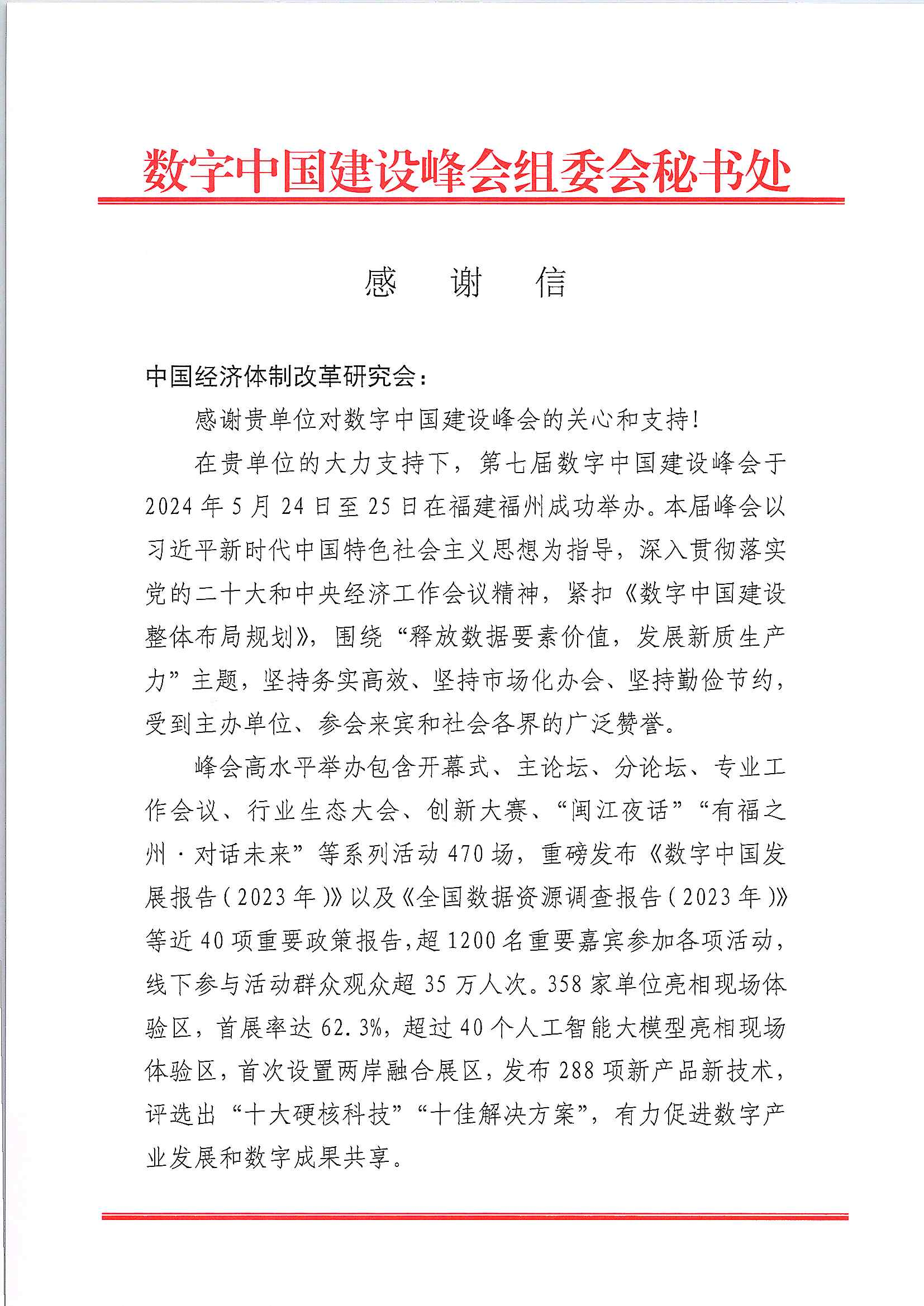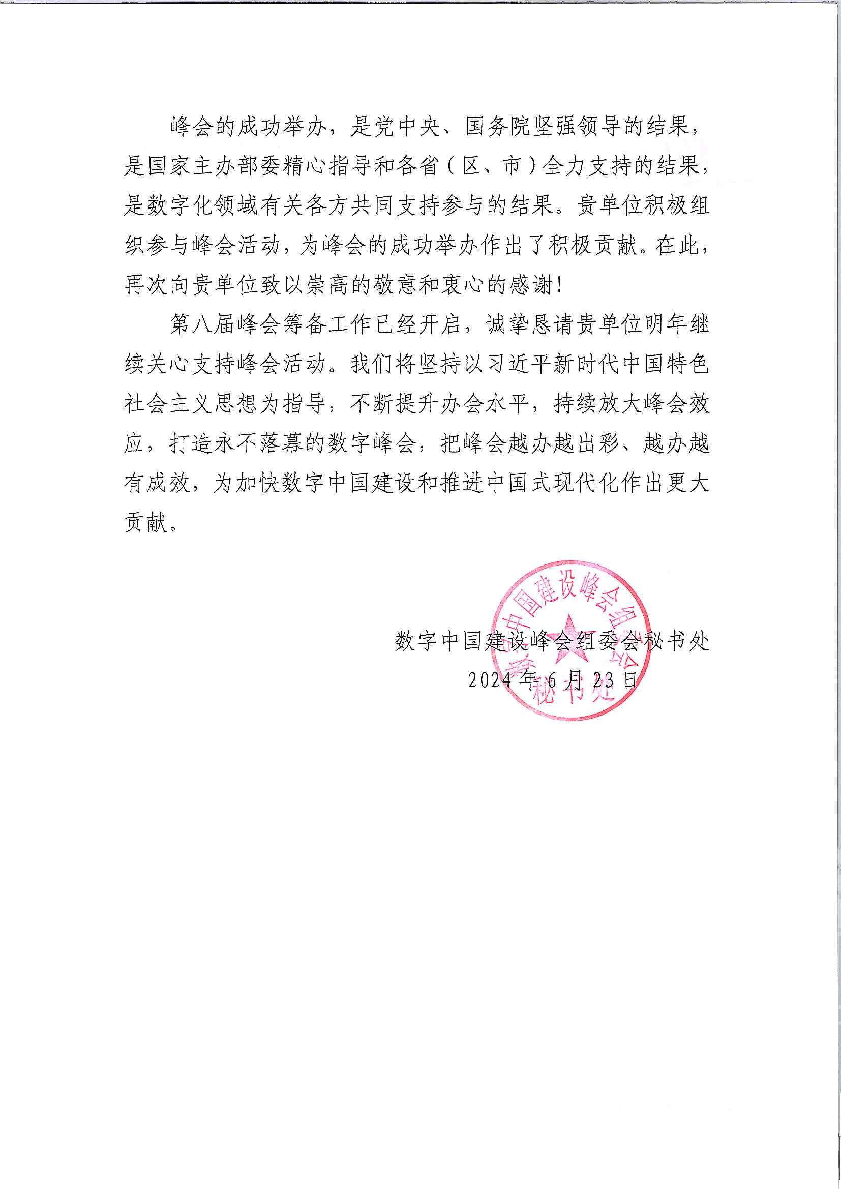 日前,我會(huì)收到來(lái)自數(shù)字中國(guó)建設(shè)峰會(huì)組委會(huì)的感謝信。信中就我會(huì)對(duì)第七屆數(shù)字中國(guó)建設(shè)峰會(huì)成功舉辦的支持表示感謝。未來(lái)我會(huì)將繼續(xù)積極組織參與峰會(huì)活動(dòng),為加快數(shù)字中國(guó)建設(shè)和推進(jìn)中國(guó)式現(xiàn)代化作出更大貢獻(xiàn)。