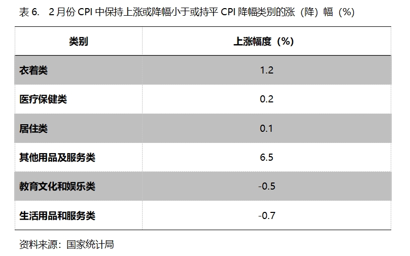 CPI中保持上漲的類別共4類,即衣著類價格同比上漲1.2%,醫(yī)療保健類上漲0.2%,居住類上漲0.1%,其他用品和服務類上漲6.5%;降幅小于或持平CPI降幅的類別共2類,即教育文化和娛樂類下降0.5%,生活用品及服務下降0.7%。
