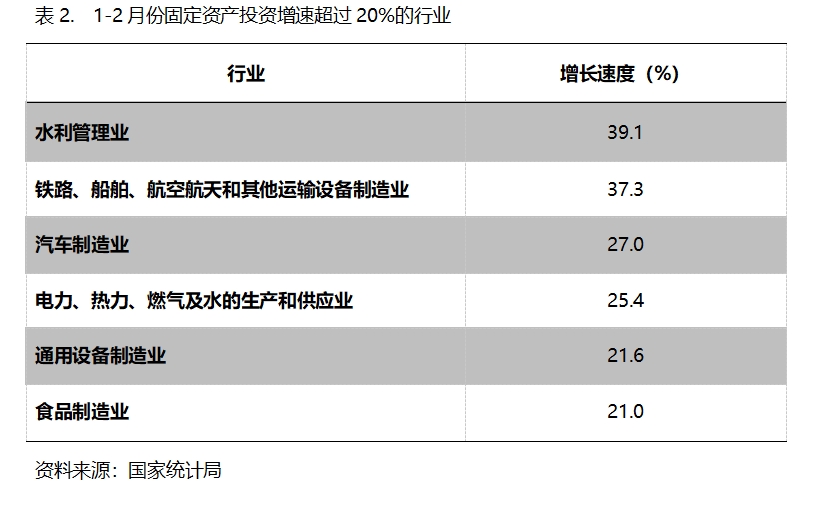 1-2月份,固定資產(chǎn)投資增速超過20%的主要行業(yè)共6個,即水利管理業(yè)增長39.1%,鐵路、船舶、航空航天和其他運輸設備制造業(yè)增長37.3%,汽車制造業(yè)增長27.0%,電力、熱力、燃氣及水的生產(chǎn)和供應業(yè)增長25.4%,通用設備制造業(yè)增長21.6%,食品制造業(yè)增長21.0%。