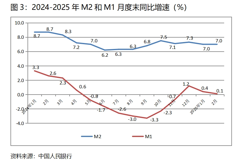 (三)M2增速由落轉(zhuǎn)平。2月末,廣義貨幣供應量(M2)同比增長7.0%,與1月末增長7.0%持平,1月末增速比上年12月末增速回落了0.3個百分點;狹義貨幣供應量(M1)增速持續(xù)回落,2月末同比增長0.1%,比1月末增長0.4%回落0.3個百分點,而1月末增幅比上年12月末增幅回落0.8個百分點;流通中貨幣(M0)增速由升轉(zhuǎn)落,2月末同比增長9.7%,比1月末增長17.2%回落了7.5個百分點,而1月末增速比上年12月末增速回升了4.2個百分點。按照貨幣政策適度寬松的要求,貨幣供應量增速存在著提速的必要。