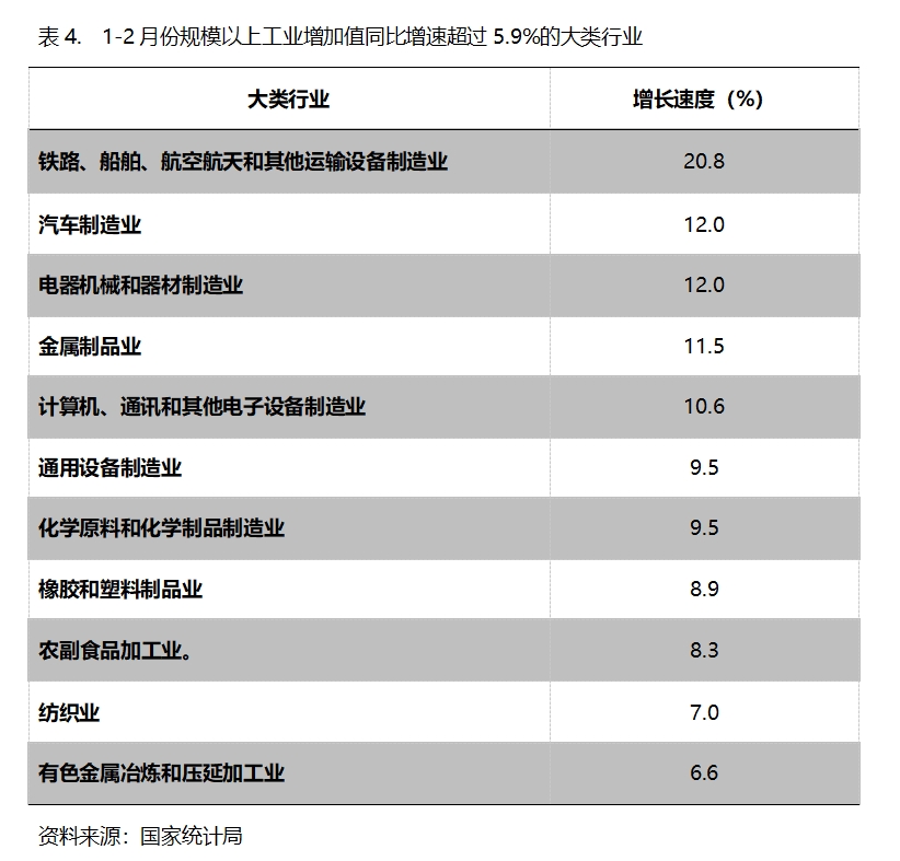 1-2月份,增長速度超過規(guī)模以上工業(yè)增長5.9%的主要大類行業(yè)共有11個,即鐵路、船舶、航空航天和其他運輸設備制造業(yè)增長20.8%,汽車制造業(yè)增長12.0%,電器機械和器材制造業(yè)增長12.0%,金屬制品業(yè)增長11.5%,計算機、通訊和其他電子設備制造業(yè)增長10.6%,通用設備制造業(yè)增長9.5%,化學原料和化學制品制造業(yè)增長9.5%,橡膠和塑料制品業(yè)增長8.9%,農(nóng)副食品加工業(yè)增長8.3%,紡織業(yè)增長7.0%,有色金屬冶煉和壓延加工業(yè)增長6.6%。