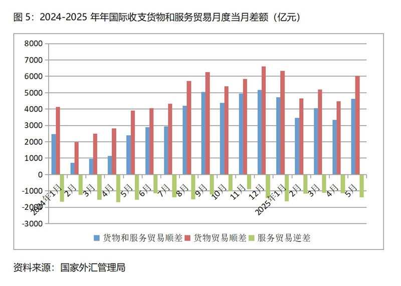 (四)國際收支貨物和服務貿(mào)易順差持續(xù)增加。今年1月份國際收支貨物和服務貿(mào)易順差比上年同月增加2252億元;2月份順差增加2735億元,3月順差增加3093億元,4月順差增加2199億元,5月順差增加2249億元,國際收支貨物和服務貿(mào)易順差比上年同期有著明顯的增加。在美國“對等關(guān)稅”政策的沖擊下,國際收支貨物和服務貿(mào)易仍實現(xiàn)較大的順差,足以說明我國經(jīng)濟有著較強的國際競爭力。