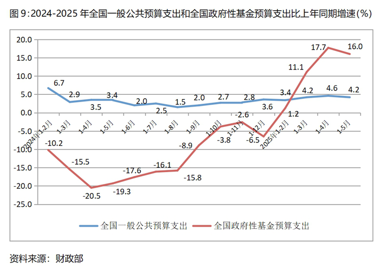 (四)一般公共預算支出增速與一季度持平、比上年同期回升,政府性基金預算支出增速比一季度回升、由上年同期下降轉(zhuǎn)為增長。1-5月份全國一般公共預算支出同比增長4.2%,與一季度增長4.2%持平,比上年同期增長3.4%回升了0.8個百分點,但增速仍有一些偏慢;全國政府性基金預算支出同比增長16.0%,比一季度增長11.1%回升4.9個百分點,上年同期為下降19.3%,呈現(xiàn)出明顯回升的態(tài)勢。從拉動經(jīng)濟增長的要求看,特別是在面對微觀經(jīng)營主體需求不足的形勢下,政府支出還需要更快一些,有必要進一步加大政府支出的力度。