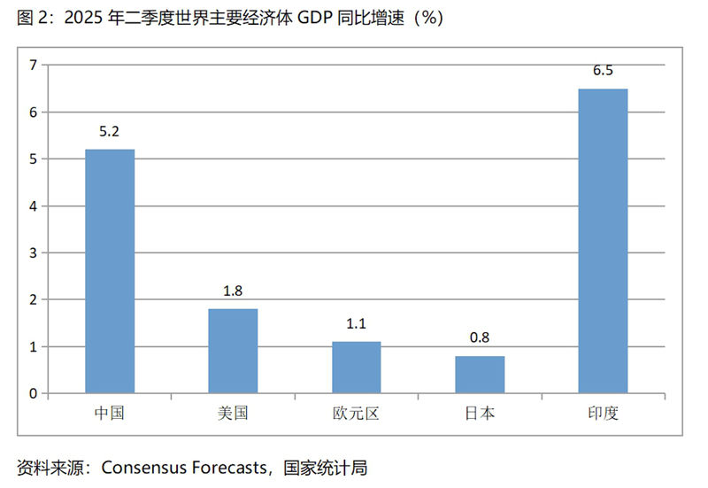 二季度5.2%的經(jīng)濟增速在世界上是比較快的增速。根據(jù)Consensus Forecasts 最新預測數(shù)據(jù),今年二季度美國GDP同比將增長1.8%,歐元區(qū)將增長1.1%,日本將增長0.8%,印度將增長6.5%,我國仍然是世界主要經(jīng)濟體中經(jīng)濟增長比較快的國家。