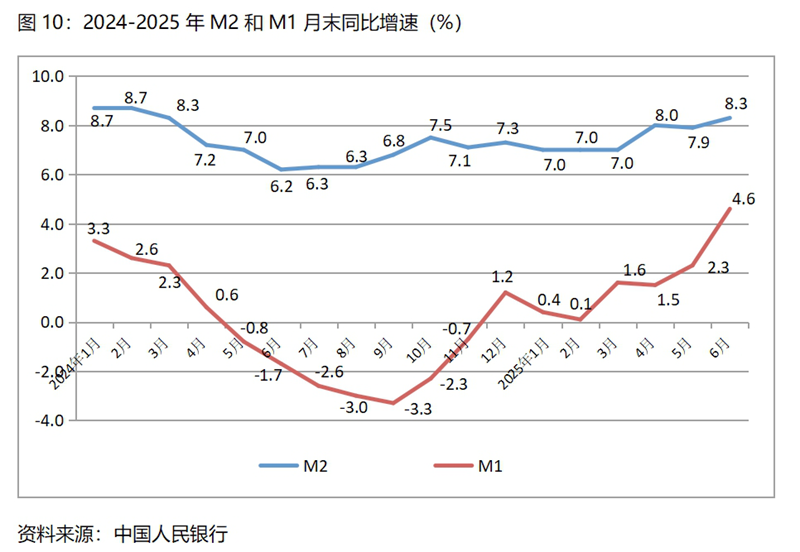 (五)廣義貨幣供應量(M2)增速比一季度末和上年同期均保持回升,狹義貨幣供應量(M1)增速比一季度末和上年同期也均保持回升。6月末,廣義貨幣供應量同比增長8.3%,比一季度末增長7.0%回升了1.3個百分點,比上年同期增長6.2%回升了2.1個百分點,總體保持了今年以來持續(xù)回升的勢頭;6月末,狹義貨幣供應量同比增長4.6%,比一季度末增長1.6%回升了3.0個百分點,而上年同期為下降1.7%。說明今年以來的貨幣政策較好地堅持了適度寬松的方向,為經(jīng)濟運行提供了較為寬松的流動性,但從微觀經(jīng)營主體活力不足和價格低位運行看,貨幣政策還有進一步寬松的必要。