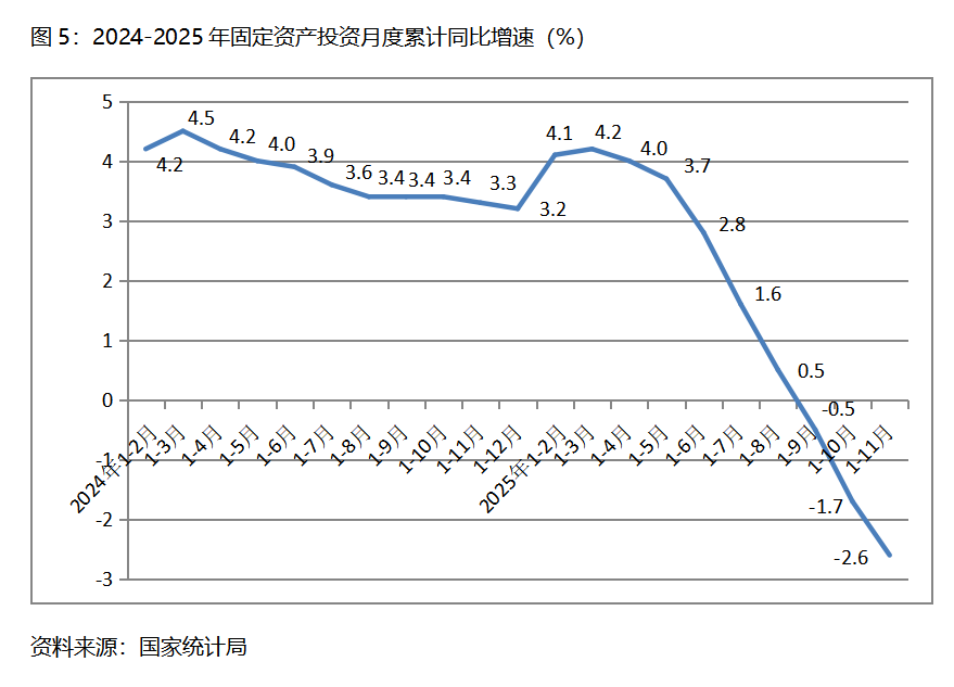 五、投資增速持續(xù)下降。1-11月份,固定資產(chǎn)投資總額同比下降2.6%,比1-10月份下降1.7%擴大了0.9個百分點,1-10月份降幅由1-9月份下降0.5%擴大了1.2個百分點,其中,1-11月份國有控股投資同比下降1.1%,1-10月份為增長0.1%;民間投資下降5.3%,比1-10月份下降4.5%擴大了0.8個百分點。三次產(chǎn)業(yè)投資中,第一產(chǎn)業(yè)投資同比增長2.7%,比1-10月份增長2.9%回落0.2個百分點;第二產(chǎn)業(yè)投資增長3.9%,比1-10月份增長4.8%回落0.9個百分點;第三產(chǎn)業(yè)投資下降6.3%,比1-10月份下降5.3%擴大1.0 百分點。固定資產(chǎn)投資增速數(shù)月的持續(xù)回落乃至下降,也需要引起高度關(guān)注。