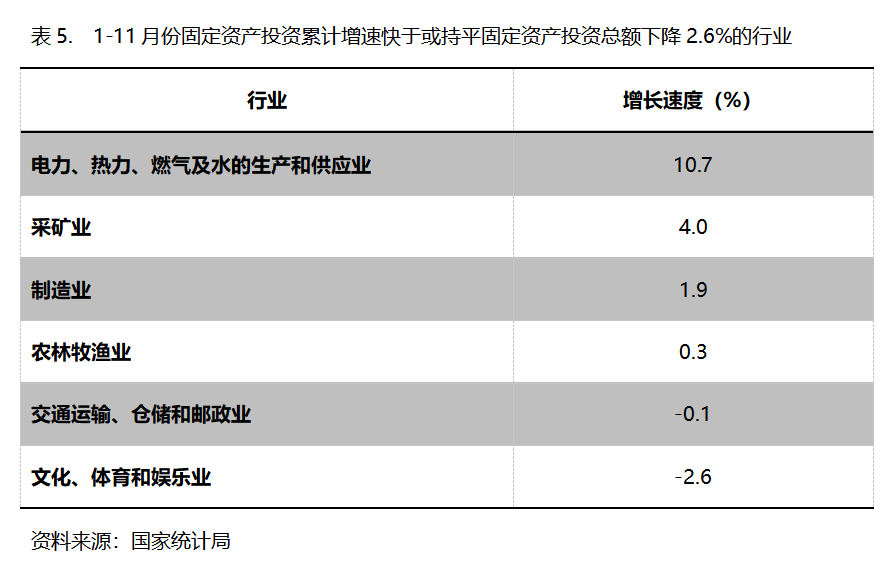 1-11月份,固定資產(chǎn)投資累計增速快于或持平固定資產(chǎn)投資總額下降2.6%的行業(yè)共6個,即電力、熱力、燃?xì)饧八纳a(chǎn)和供應(yīng)業(yè)增長10.7%,采礦業(yè)增長4.0%,制造業(yè)增長1.9%。農(nóng)林牧漁業(yè)增長0.3%,交通運輸、倉儲和郵政業(yè)下降0.1%,文化、體育和娛樂業(yè)下降2.6%。