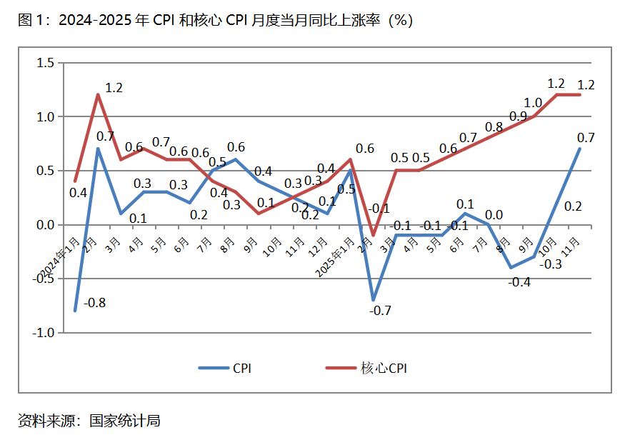 一、CPI漲幅持續(xù)回升。11月份,CPI同比上漲0.7%,比10月份上漲0.2%回升0.5個百分點,10月份由9月份下降0.3%轉(zhuǎn)為上漲;核心CPI同比上漲1.2%,與10月份上漲1.2%持平,10月份比9月份上漲1.0%回升了0.2個百分點。CPI漲幅回升較為為明顯,核心CPI漲幅保持穩(wěn)定,表明經(jīng)濟(jì)運行活力繼續(xù)增強,但由于漲幅仍較為有限,加之較長時期處于偏低水平,經(jīng)濟(jì)運行活力還有待進(jìn)一步提高。