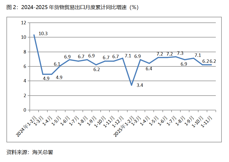 二、出口增速由落轉(zhuǎn)平。1-11月份,貨物出口同比增長6.2%,與1-10月份增長6.2%持平,1-10月份比1-9月份增長7.1%回落0.9個百分點。貨物出口對主要貿(mào)易出口經(jīng)濟(jì)體增速有升有落有平,1-11月份對歐盟出口同比增長8.9%,比1-10月份對歐盟出口同比增長8.4%回升0.5個百分點;對美國出口下降18.3%,比1-10月份下降17.1%擴大1.2個百分點;對東盟出口增長14.6%,比1-10月份增長15.3%回落0.7個百分點;對拉丁美洲出口增長7.9%,比1-10月份增長7.3%回升0.6個百分點;對非洲出口增長27.2%,與1-10月份增長27.2%持平。貨物出口在跌宕起伏的國際形勢下仍保持穩(wěn)定增長,彰顯出我國對外貿(mào)易的較強韌性。