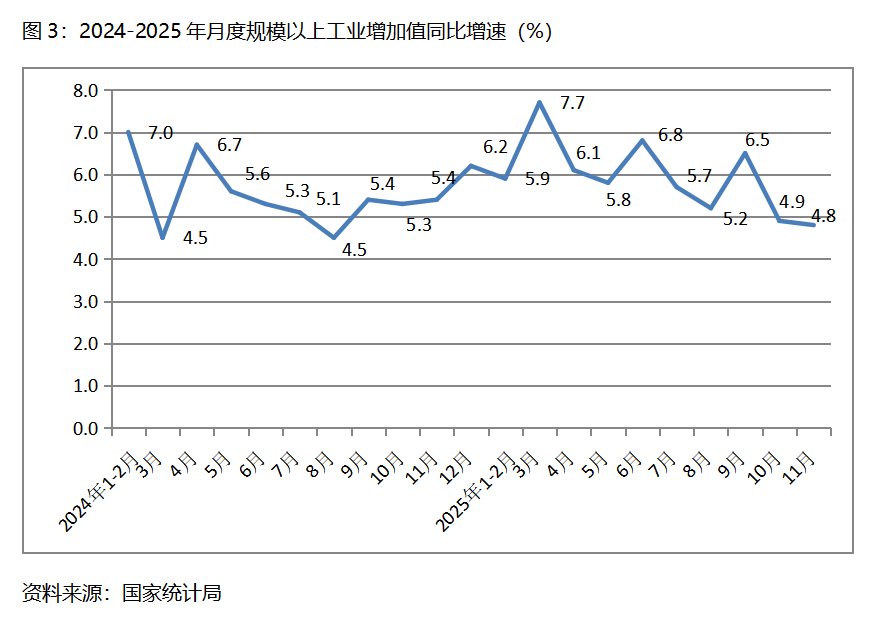 三、工業(yè)增速持續(xù)回落。11月份,規(guī)模以上工業(yè)增加值同比增長4.8%,比10月份增長4.9%回落了0.1個百分點,10月份比9月份增長6.5%回落了1.6個百分點。從工業(yè)三大門類看,采礦業(yè)增速比上月回升,制造業(yè)和電力、熱力、燃?xì)饧八a(chǎn)和供應(yīng)業(yè)增速回落,11月份,采礦業(yè)同比增長6.3%,比上月增長4.5%回升1.8個百分點;制造業(yè)增長4.6%,比上月增長4.9%回落0.3個百分點;電力、熱力、燃?xì)饧八a(chǎn)和供應(yīng)業(yè)增長4.3%,比上月增長5.4回落1.1個百分點。