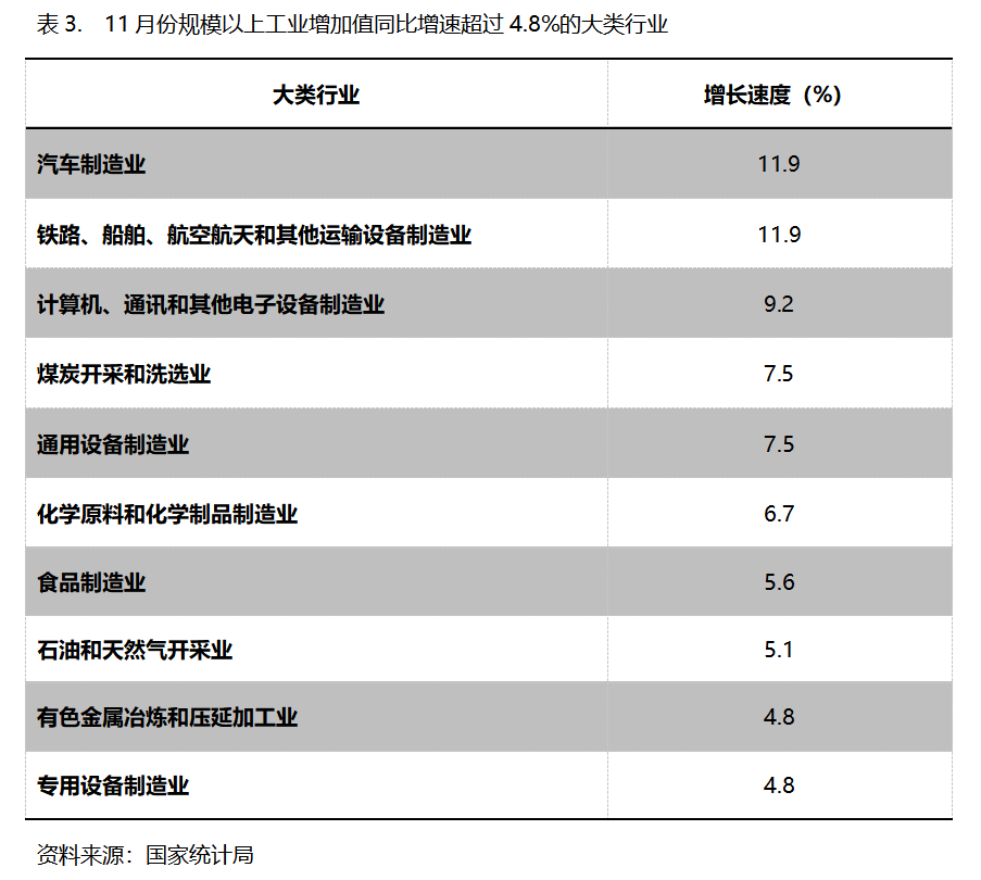 11月份,增長速度超過或持平規(guī)模以上工業(yè)增長4.8%的主要大類行業(yè)共有10個,即汽車制造業(yè)同比增長11.9%,鐵路、船舶、航空航天和其他運輸設(shè)備制造業(yè)增長11.9%,計算機、通訊和其他電子設(shè)備制造業(yè)增長9.2%,煤炭開采和洗選業(yè)增長7.5%,通用設(shè)備制造業(yè)增長7.5%,化學(xué)原料和化學(xué)制品制造業(yè)增長6.7%,食品制造業(yè)增長5.6%,石油和天然氣開采業(yè)增長5.1%,有色金屬冶煉和壓延加工業(yè)增長4.8%,專用設(shè)備制造業(yè)增長4.8%。