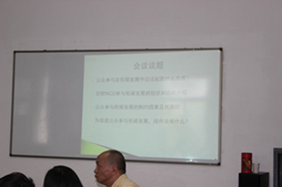 出席會議的代表有:社區(qū)行動服務(wù)中心的宋慶華、王瑞卿、綠色和平組織的徐曼、中國綠色碳匯基金會的蘇宗海、樂施會的呂美、北京地球村環(huán)境教育中心的王欣超、中國民促會綠色出行基金的費軼群和任慧、北京理工大學(xué)管理與經(jīng)濟學(xué)院的李亞教授、中國經(jīng)濟體制改革雜志社的記者張?zhí)m太等。我會《低碳發(fā)展公眾參與的政策設(shè)計》課題組成員趙迪、何林也出席了會議。