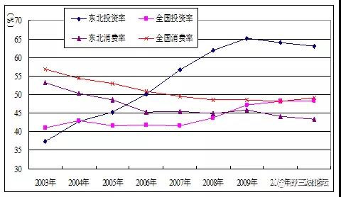 我們可以看看,從2003年到2012年這十年,實(shí)際上東北很多問(wèn)題并沒(méi)有真正解決,比如投資率、消費(fèi)率比嚴(yán)重扭曲,東北比全國(guó)要嚴(yán)重的多。三省投資率由2003年的37.3%上升至2011年的63.1%,提高了25.8個(gè)百分點(diǎn),而同期全國(guó)由41%增長(zhǎng)到48.3%,提高了7.3個(gè)百分點(diǎn);消費(fèi)率由53.2%下降至43.2%,降低10個(gè)百分點(diǎn),而同期全國(guó)由56.9%下降至49.1%,降低7.8個(gè)百分點(diǎn)。全國(guó)的投資率已經(jīng)過(guò)高了,東北的投資消費(fèi)比例更加扭曲。